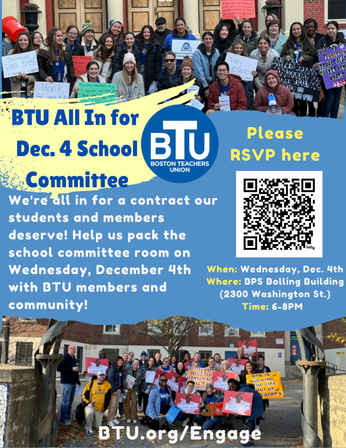 This is a perfect opportunity to make your voice heard and to remind the School Committee, the Superintendent and the Mayor that the BTU has the backing of educators, families and the community. Tell your colleagues, friends, family and neighbors about December 4th! You can direct them to btu.org/engage so they can endorse our contract and write a letter to the Superintendent. Please register here if you plan to attend in-person on December 4th.